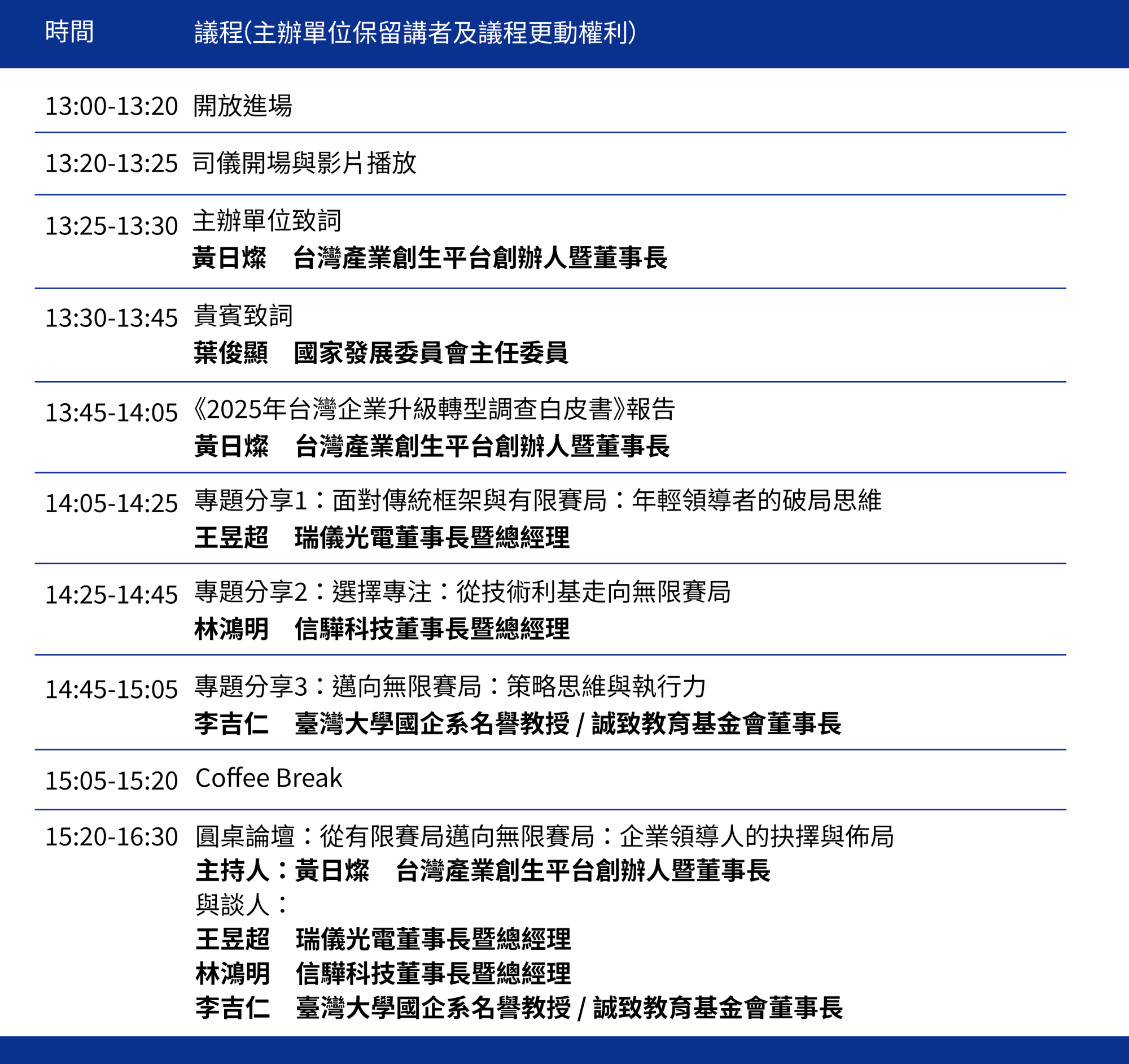 本次論壇將以「從有限賽局邁向無限賽局」為主題,結合調查白皮書發表與產業領袖對談,邀請具備實戰經驗與戰略視野的企業家與學者,共同探討企業如何打造下一階段的成長動能與存在價值。這不只是一次經驗分享,更是一場思維的轉向,一場通往長期競爭力與系統韌性的集體練習。