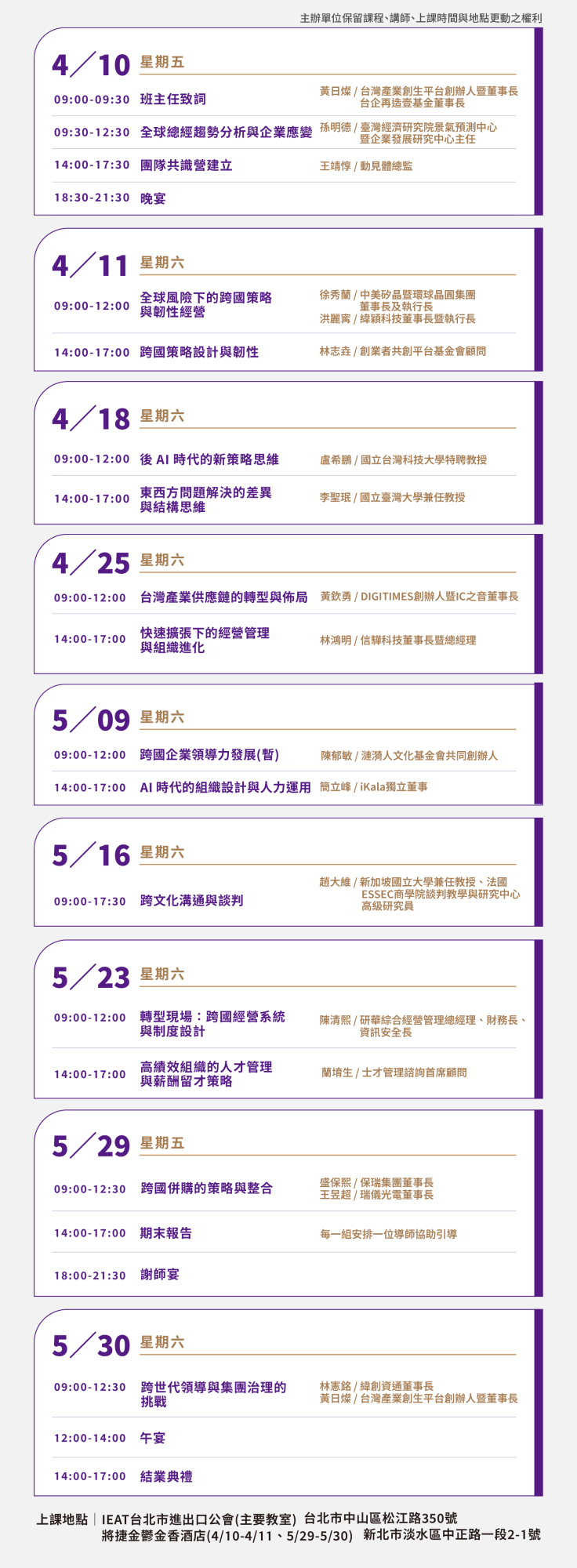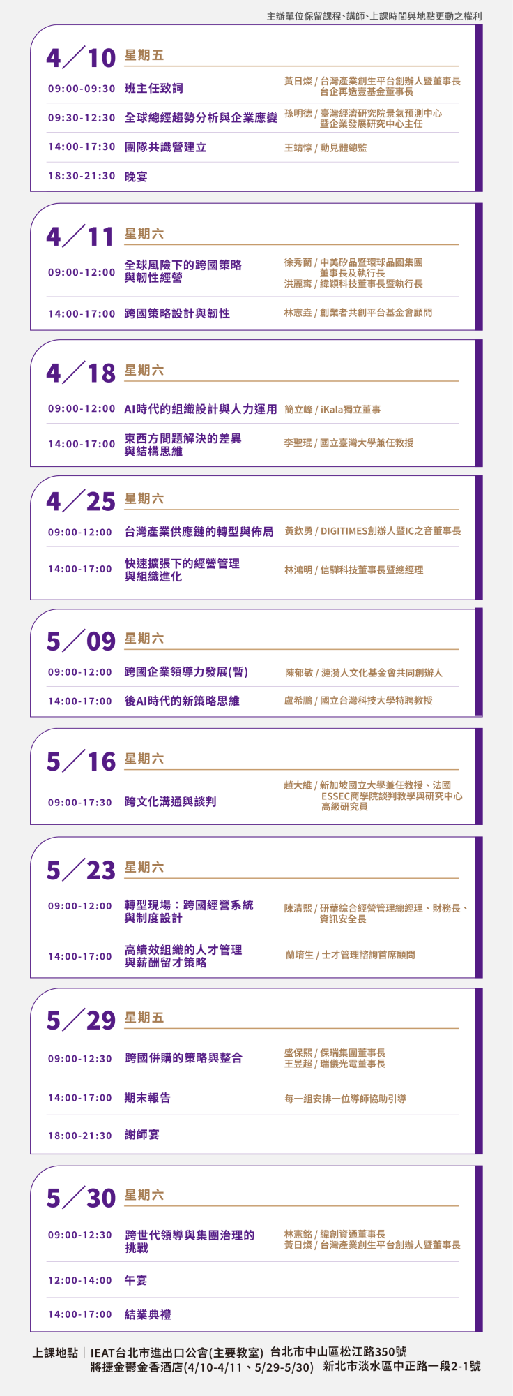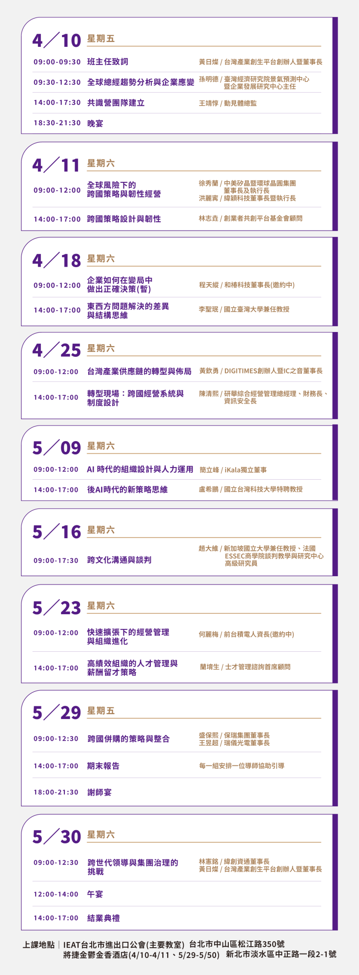 過去五屆「跨國在地經營菁英班」深受學員好評與企業鼓勵,平台刻正規畫「2026年跨國在地經營菁英班」,課程安排於2026年4-5月週末上課,同樣邀請重量級的業師授課,涵蓋全球總經趨勢分析、跨國經營系統建立、AI智慧管理跨國供應鏈、跨國人才招募與團隊建立、跨文化溝通與談判、跨國併購的策略與整合等內容。
