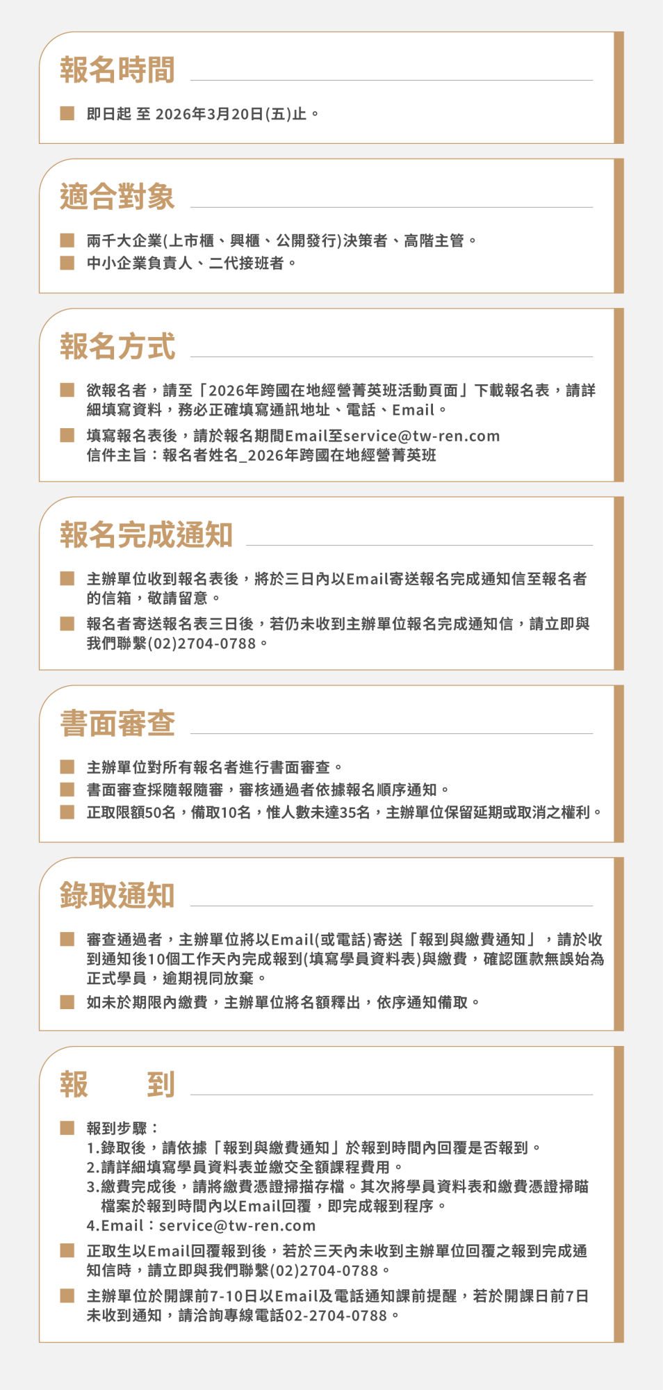 在全球化+在地化的趨勢下,整個產業面臨艱辛挑戰,但也看到許多新契機,布局未來要從投資人才做起。竭誠歡迎上市櫃公司推薦高階主管、中小企業決策者或二代接班人報名「2026年跨國在地經營菁英班」,培養更多具備國際競爭力的經營戰將,為企業開創新局!