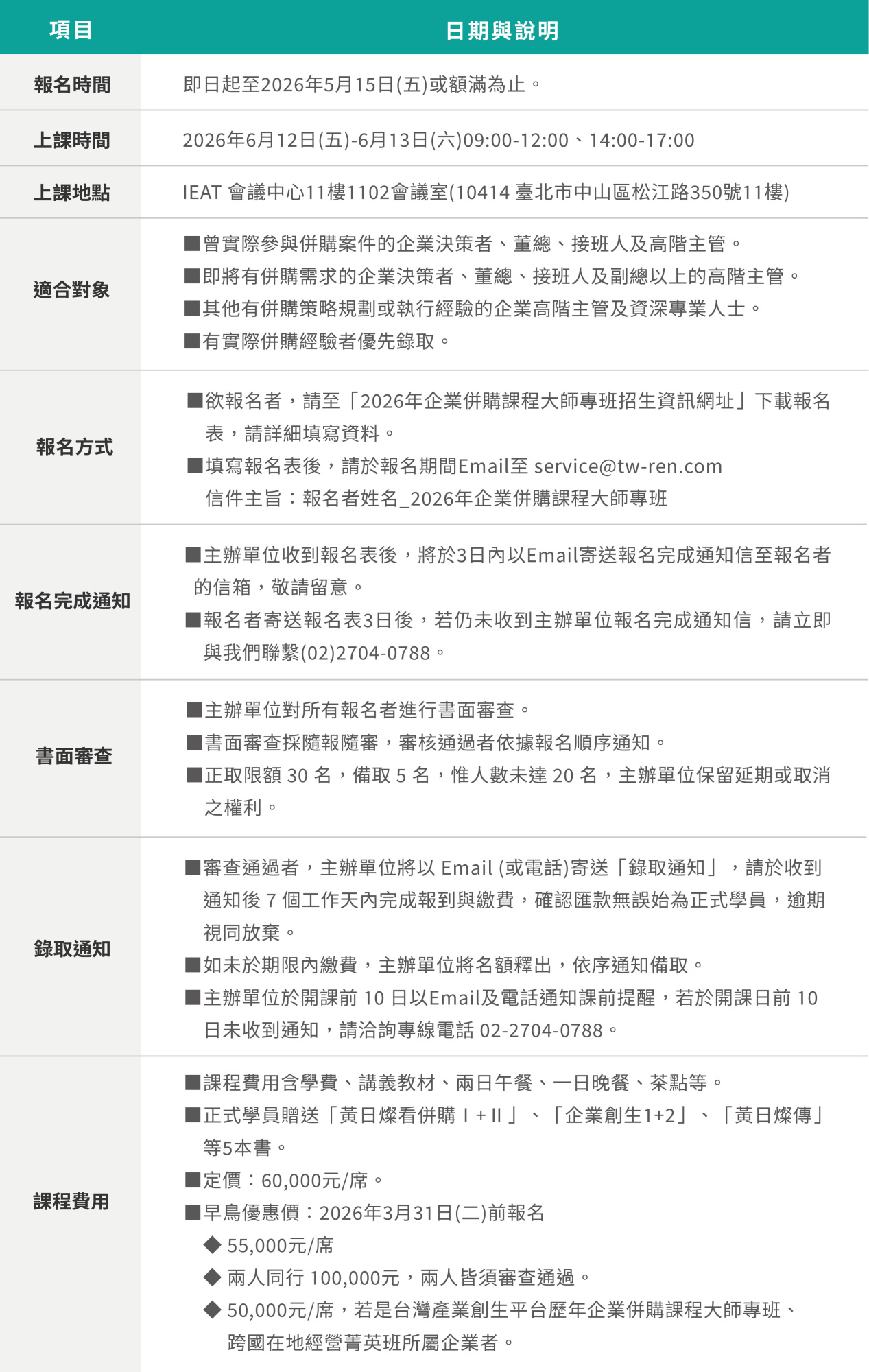 - 即將有併購計劃或需求的企業決策者、董總、接班人及副總以上的高階主管。