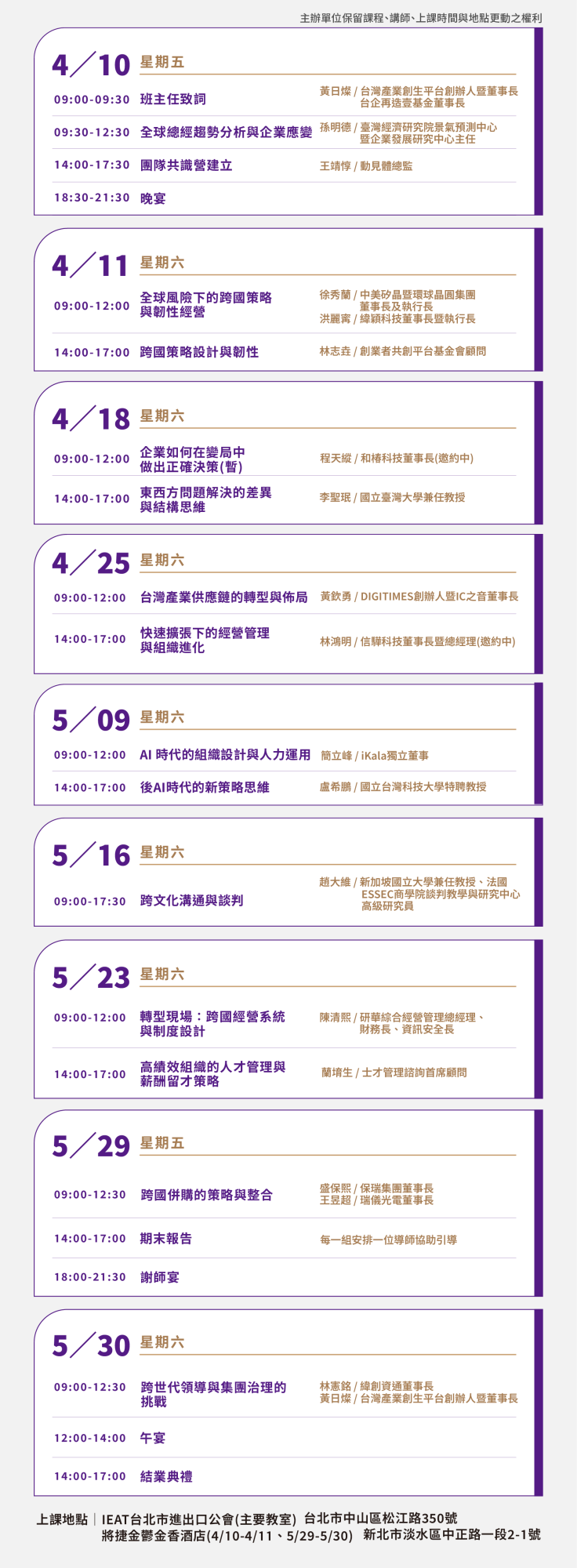 過去五屆「跨國在地經營菁英班」深受學員好評與企業鼓勵,平台刻正規畫「2026年跨國在地經營菁英班」,課程安排於2026年4-5月週末上課,同樣邀請重量級的業師授課,涵蓋全球總經趨勢分析、跨國經營系統建立、AI智慧管理跨國供應鏈、跨國人才招募與團隊建立、跨文化溝通與談判、跨國併購的策略與整合等內容。
