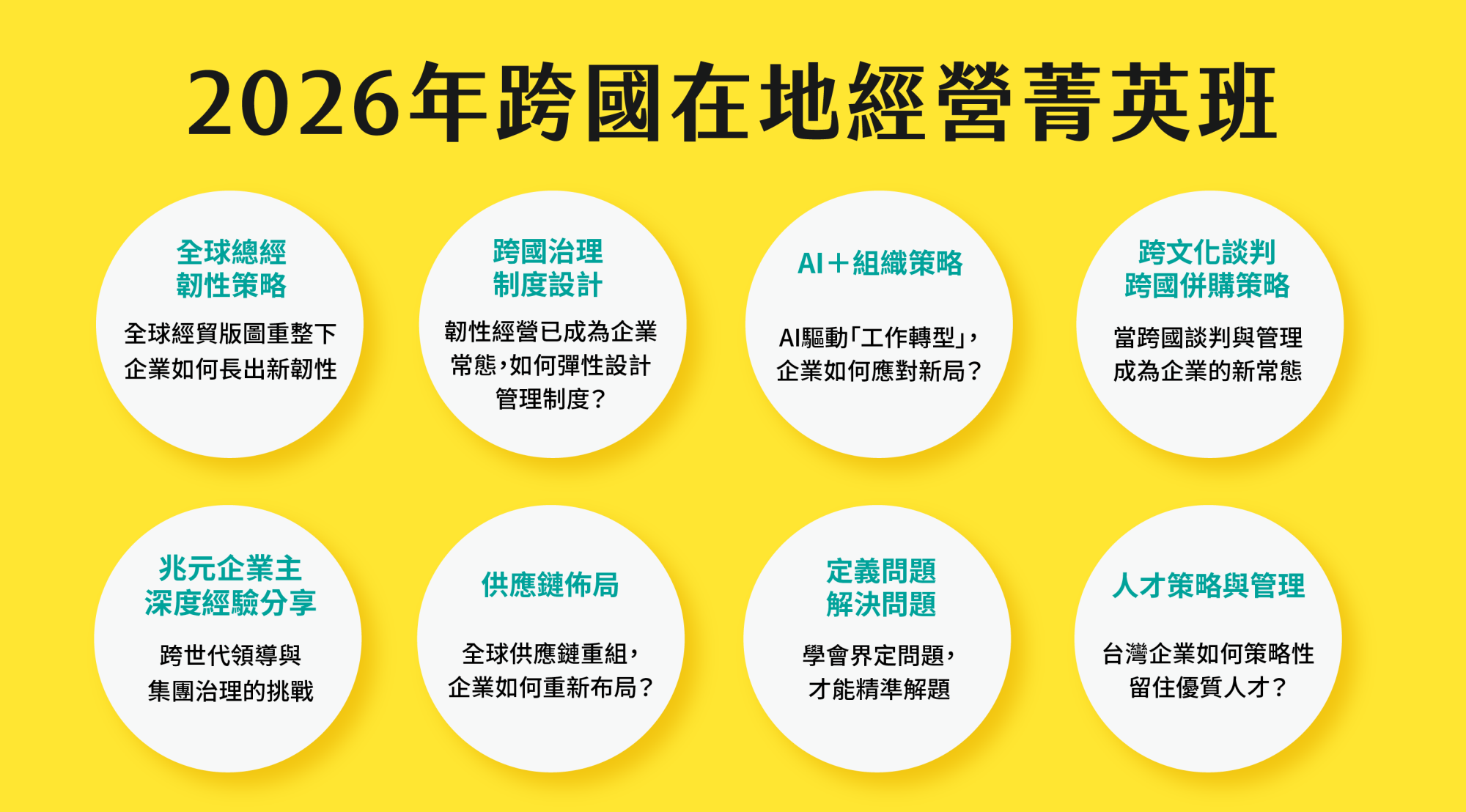 在企業面臨動盪與調整的需求下,2026年,平台所舉辦的「跨國在地經營菁英班」,從務實應對趨勢出發,提供跨國治理完整課程之八大模組,邀請各界重量級的企業領袖與學者專家親自授課,協助學員有系統地深化經營領導力。