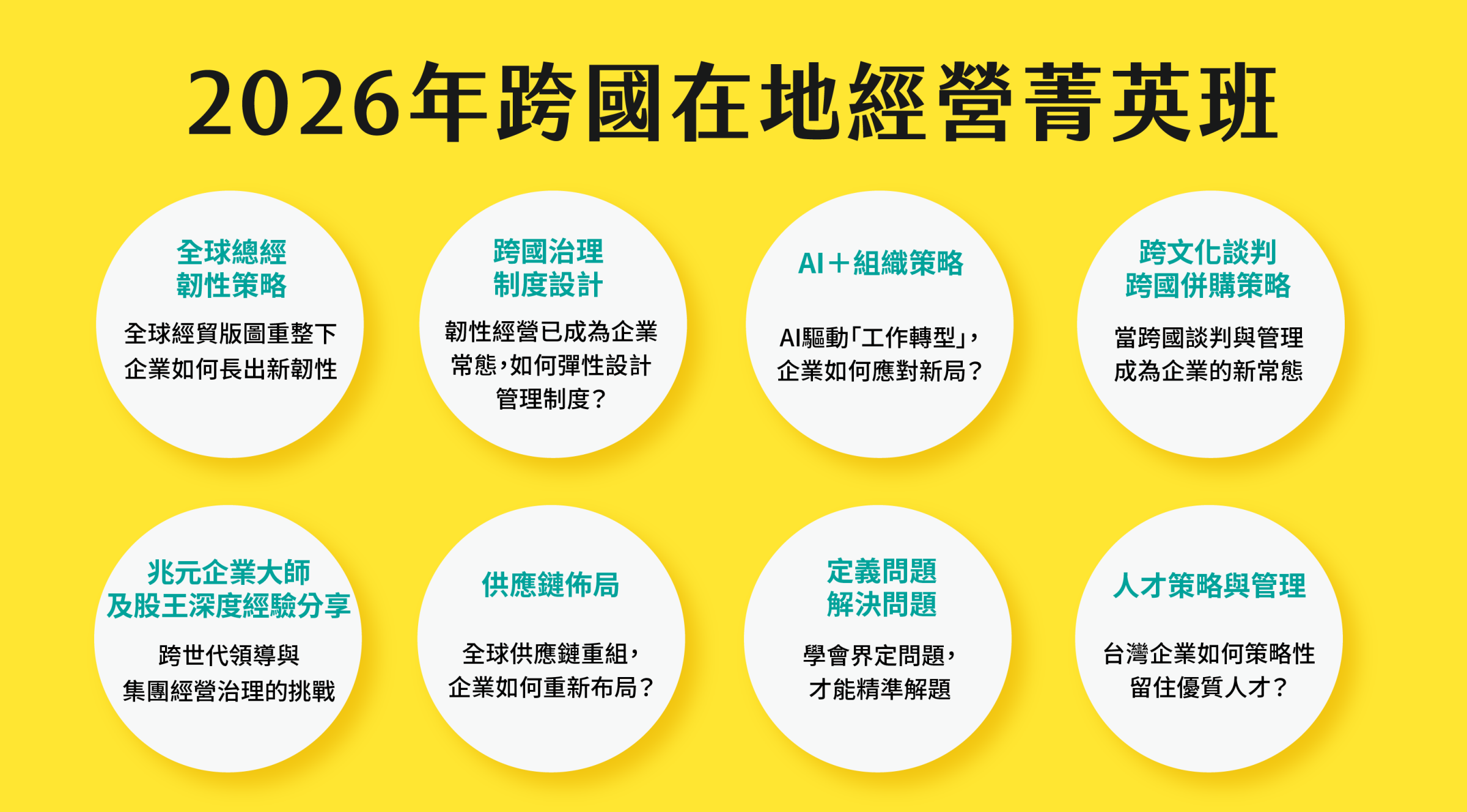 「2026年跨國在地經營菁英班」課程內容涵蓋全球總經趨勢分析、跨國經營系統建立、AI智慧管理跨國供應鏈、跨國人才招募與團隊建立、跨文化溝通與談判、跨國併購的策略與整合等內容,是全台真正以「跨國治理」為核心所建構的高階課程。